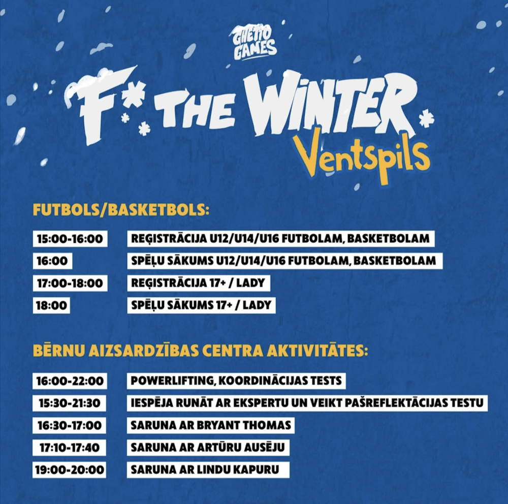 Olimpiskajā centrā "Ventspils" 14. janvārī risināsies ziemas sezonas aktīvākais jauniešu pasākums "Forget The Winter", kas apvienos sportu, izglītojošas aktivitātes un atklātas sarunas par jauniešiem svarīgām tēmām. Pasākuma laikā bērniem un jauniešiem būs iespēja bez maksas piedalīties 3x3 basketbola un futbola sacensībās, izmēģināt dažādas interaktīvas aktivitātes, kā arī klausīties sarunas ar pieredzējušiem sportistiem un nozares profesionāļiem.